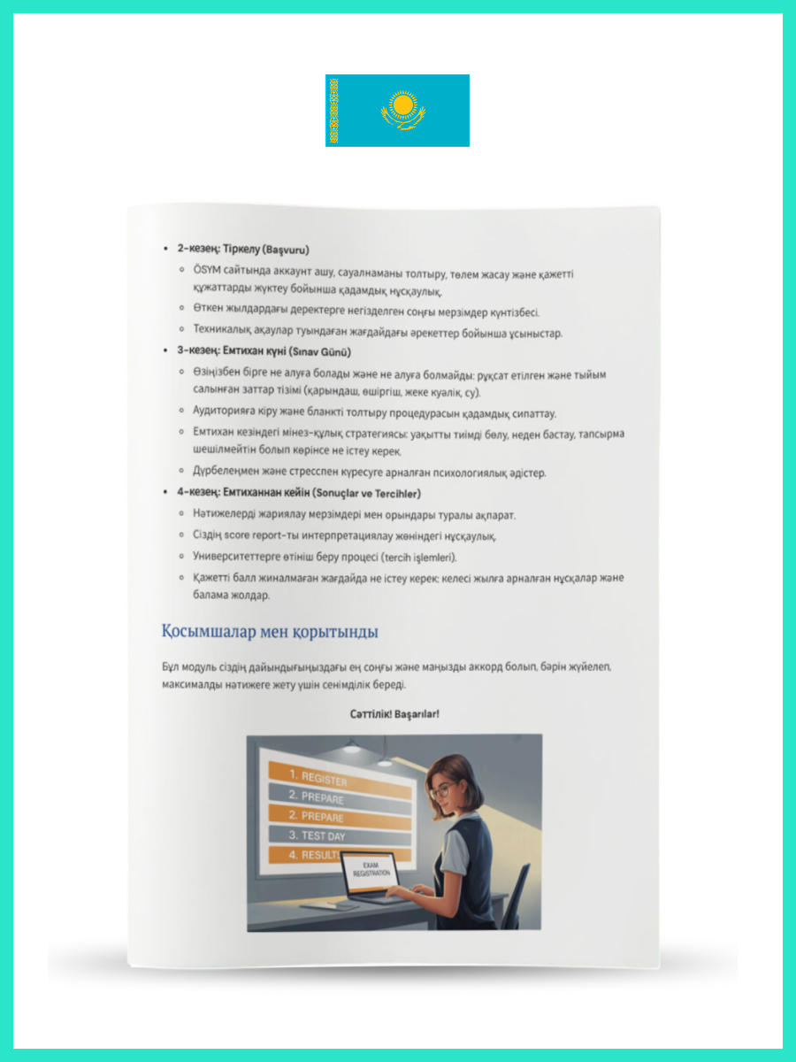 Full support: Rules, schedules, and preparation schedules will help you structure your learning process. We have also included all the necessary information about the exam, procedures, documents, and a glossary of specialised terms in Turkish.