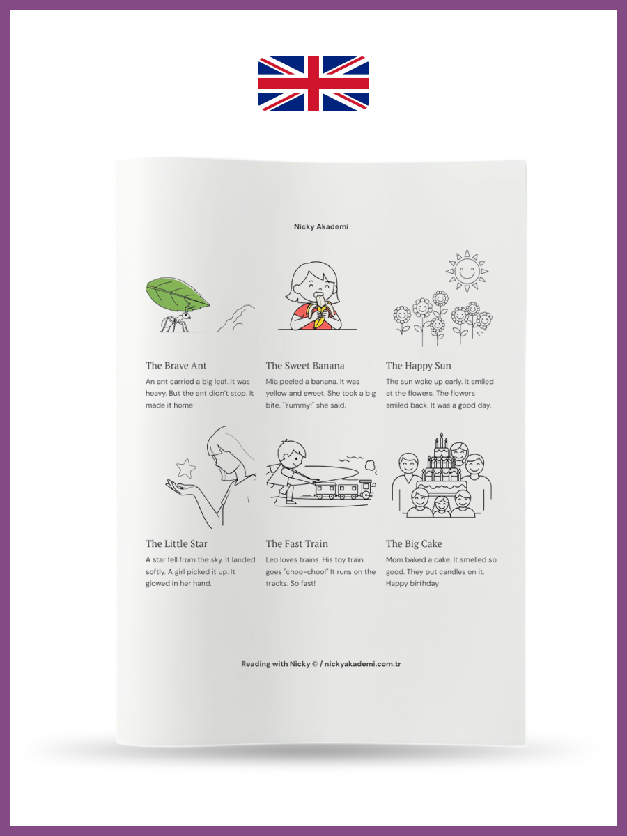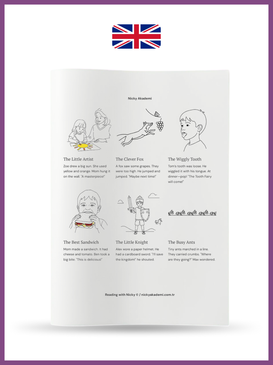 Master English step-by-step! 10 fun levels: Start with super-short stories (3-4 sentences + coloring picture) and grow to confident reading. Each page has 4-5 mini-tales.