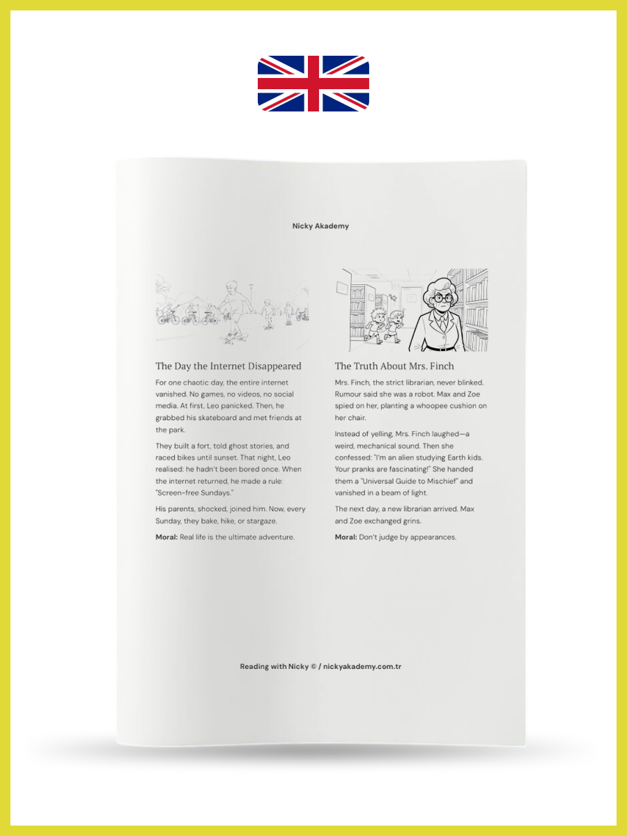 Master English step-by-step! 10 fun levels: Start with super-short stories and grow to confident reading. Each page has 2 mini-tales.