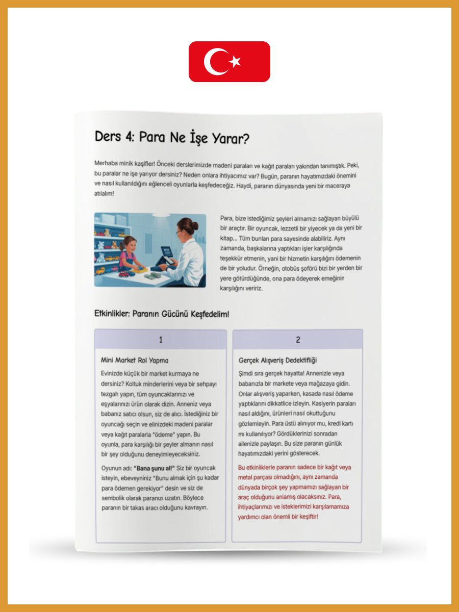 Level 1 (Ages 5-6): Through stories and games, we learn to count money, distinguish between “wants” and “needs,” and understand the value of work.
